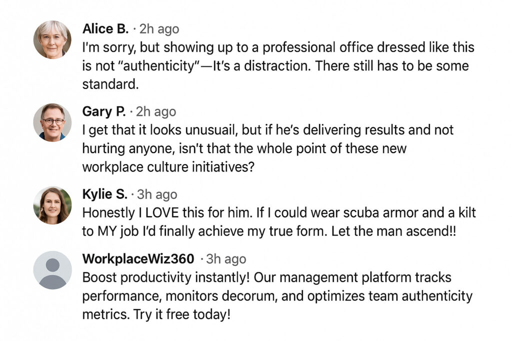 This dual commitment was highlighted earlier this week by the presence of Senior Administrative Associate Jacob Renwick, whose eclectic attire drew attention while he executed his day-to-day responsibilities with consistent accuracy and professionalism. While Renwick’s combination of SCUBA gear, kilt, medieval chest plate, feathered wing accessory, and beverage-dispensing headgear may initially appear unconventional in a traditional office setting, supervisors report that his output remains fully aligned with departmental requirements and quarterly objectives.