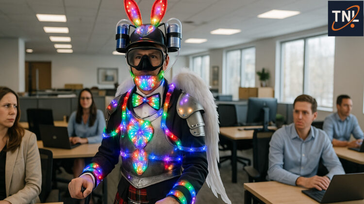 This dual commitment was highlighted earlier this week by the presence of Senior Administrative Associate Jacob Renwick, whose eclectic attire drew attention while he executed his day-to-day responsibilities with consistent accuracy and professionalism. While Renwick’s combination of SCUBA gear, kilt, medieval chest plate, feathered wing accessory, and beverage-dispensing headgear may initially appear unconventional in a traditional office setting, supervisors report that his output remains fully aligned with departmental requirements and quarterly objectives.