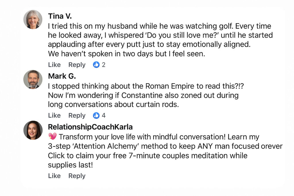 Nothing resets a man’s brain faster than an unexpected test. End any monologue with, “So, what do you think we should do?” Watch as his pupils dilate like a startled deer remembering its mortgage. Bonus: this works in cars, restaurants, or any enclosed space where escape is impractical.